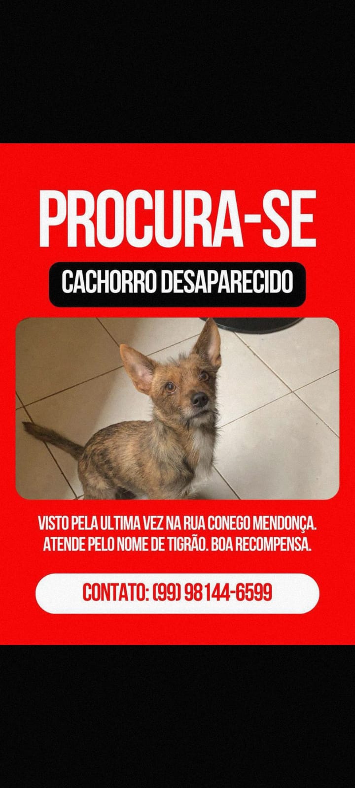 Estamos à procura do nosso querido Tigrão, um cachorrinho muito amado por sua família e que está desaparecido. Ele foi visto pela última vez na