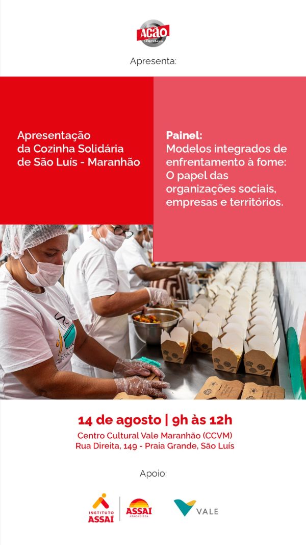 É com grande satisfação que a Ação da Cidadania, com apoio do Instituto Assaí, Assaí Atacadista e Vale, convida você para a Apresentação da Cozinha