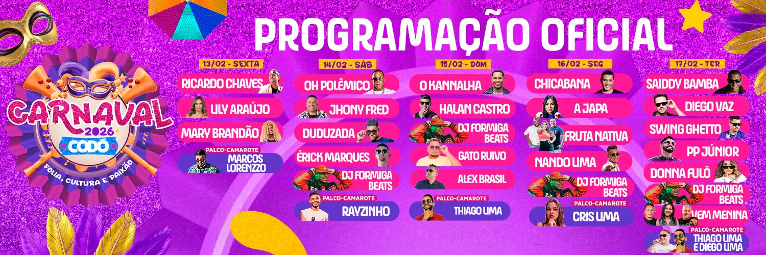 A Prefeitura de Codó, por meio da Secretaria Municipal de Cultura e Turismo, divulgou oficialmente a programação do Carnaval 2026. A festa será realizada de