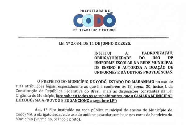 Os alunos da Rede Pública Municipal de Codó, tanto da Zona Urbana quanto da Zona Rural, acabam de conquistar um importante benefício para sua formação educacional. Foi sancionada, a Lei Nº 2.034/2025, que institui a padronização, obrigatoriedade e gratuidade do fardamento escolar para todos os estudantes da rede municipal de ensino.