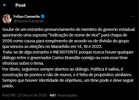 Em resposta, Camarão afirmou que a versão é “estranha” e “inexistente”, negando qualquer conversa prévia sobre composição de chapa com o governador. “Nunca houve qualquer diálogo entre o governador Carlos Brandão comigo ou com esse time vitorioso sobre o tema”, declarou, em publicação nas redes sociais.