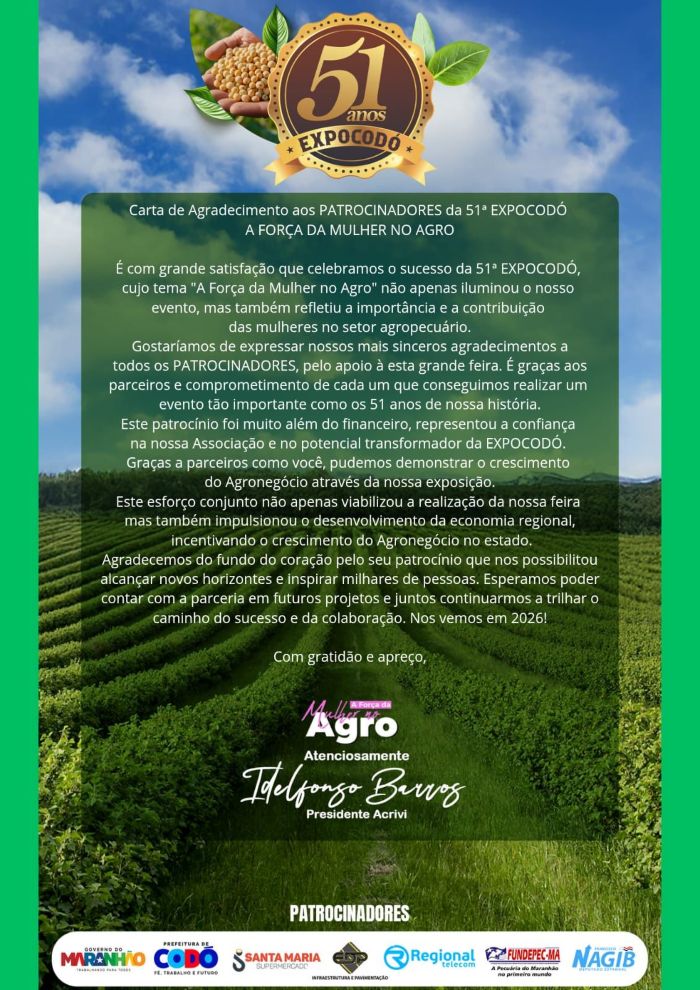 Este patrocínio foi muito além do financeiro, representou a confiança na nossa Associação e no potencial transformador da EXPOCODÓ. Graças a parceiros como você, pudemos demonstrar o crescimento do Agronegócio através da nossa exposição.