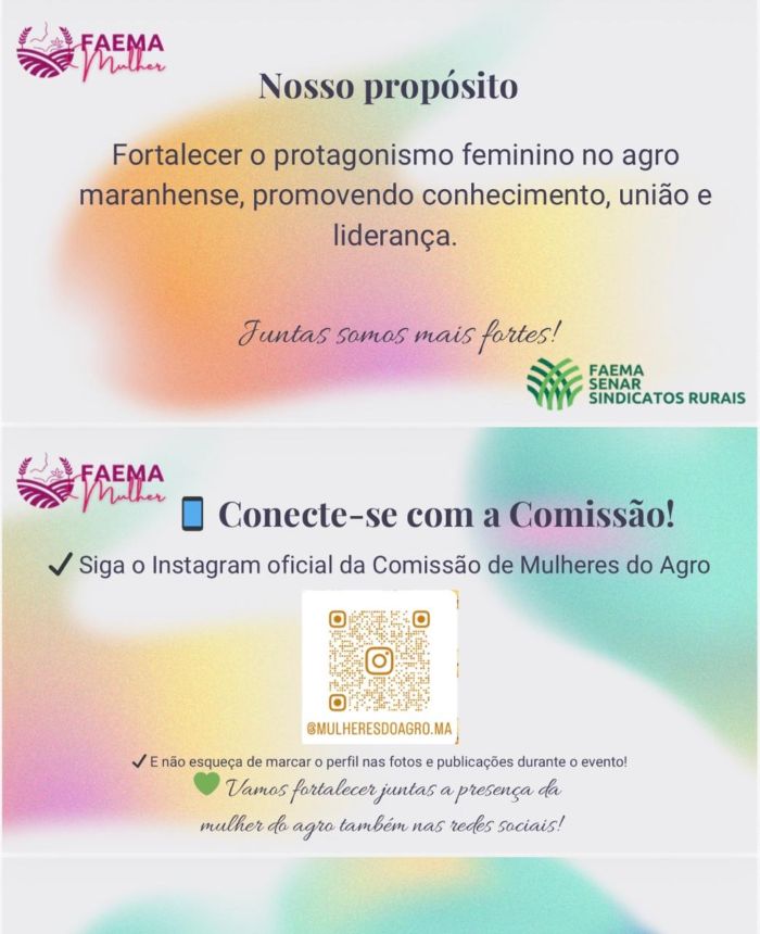 A Comissão de Mulheres do Agro – FAEMA (mulheresdoagro.ma) tem como objetivo promover a participação e o protagonismo feminino no agronegócio maranhense, contando com o apoio da FAEMA/SENAR. A comissão se concentra em capacitação técnica, networking e formação de parcerias, visando fortalecer lideranças locais e a presença feminina no sistema sindical.