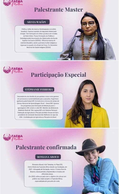 Outro destaque será a palestra de Stéphanie Ferreira, Presidente da Comissão de Mulheres do Agro da CNA, que abordará O Papel Estratégico da Comissão de Mulheres no Sistema Sindical. A palestra magna será apresentada por Silvia Waiãpi e tratará do tema “Do Silêncio à Liderança: Mulheres que Transformaram Desafios em Colheitas”. O evento encerrará com mensagens inspiradoras da Presidente Mônica Loiola e da Vice-Presidente Keyssyane Soeiro, enfatizando o papel transformador das mulheres no agronegócio.