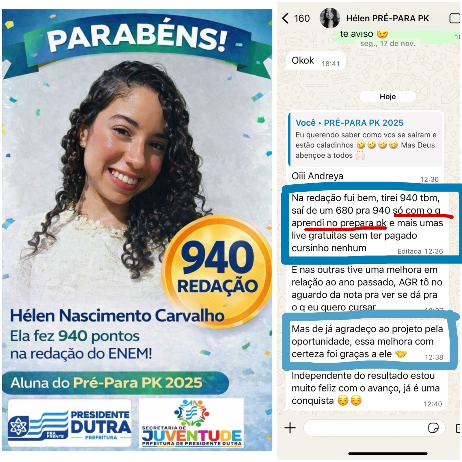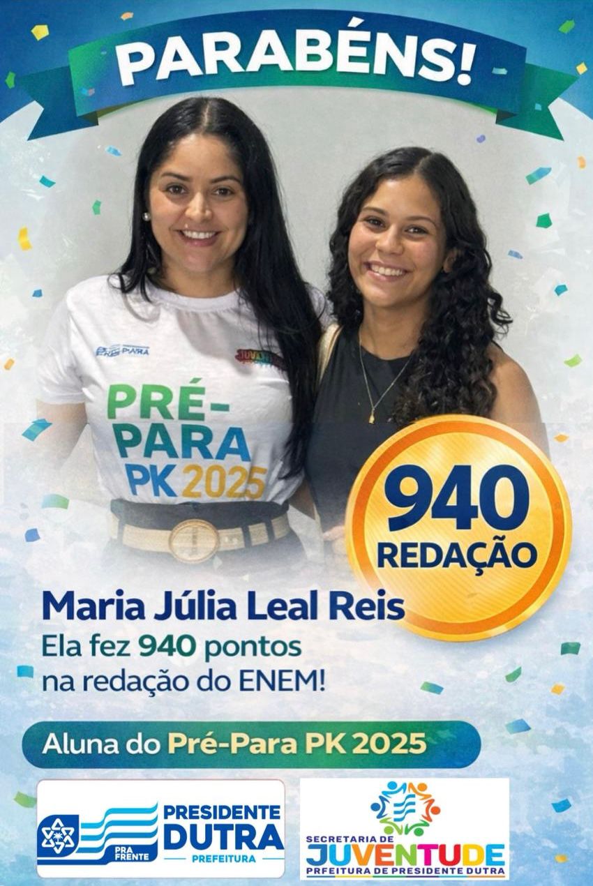 A Secretaria Municipal da Juventude de Presidente Dutra, sob o comando da secretária Andrheya do Jurandy, e o aval do prefeito Raimundinho, iniciou no mês de agosto de 2025 um cursinho preparatório para o ENEM com professores renomados de Teresina somente aos finais de semana. “ Foi uma iniciativa total da prefeitura de Presidente Dutra que deu suporte para esses jovens, inclusive tivemos aulas também em Teresina, tudo com o apoio do prefeito Raimundinho”. Frisou a secretária. O pré-para PK foi uma iniciativa que  ganhou ainda mais visibilidade após duas alunas do programa conquistarem nota máxima na redação do ENEM. Hélen Nascimento Carvalho e Maria Júlia Leal Reis fizeram 940 pontos na redação.