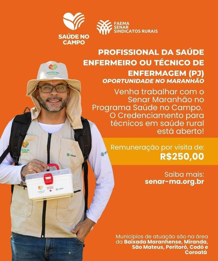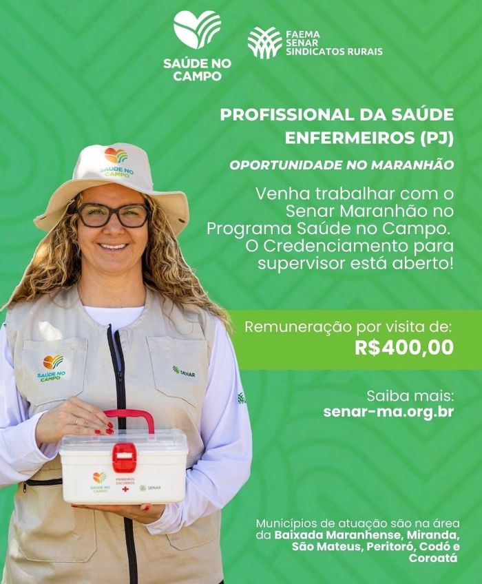 A Federação da Agricultura e Pecuária do Maranhão (FAEMA), o Serviço Nacional de Aprendizagem Rural (SENAR-MA) e os Sindicatos Rurais estão com credenciamento aberto para profissionais de saúde — enfermeiros e técnicos de enfermagem (PJ) — que desejem atuar no Programa Saúde no Campo, uma importante iniciativa voltada para o cuidado e o bem-estar da população rural maranhense.