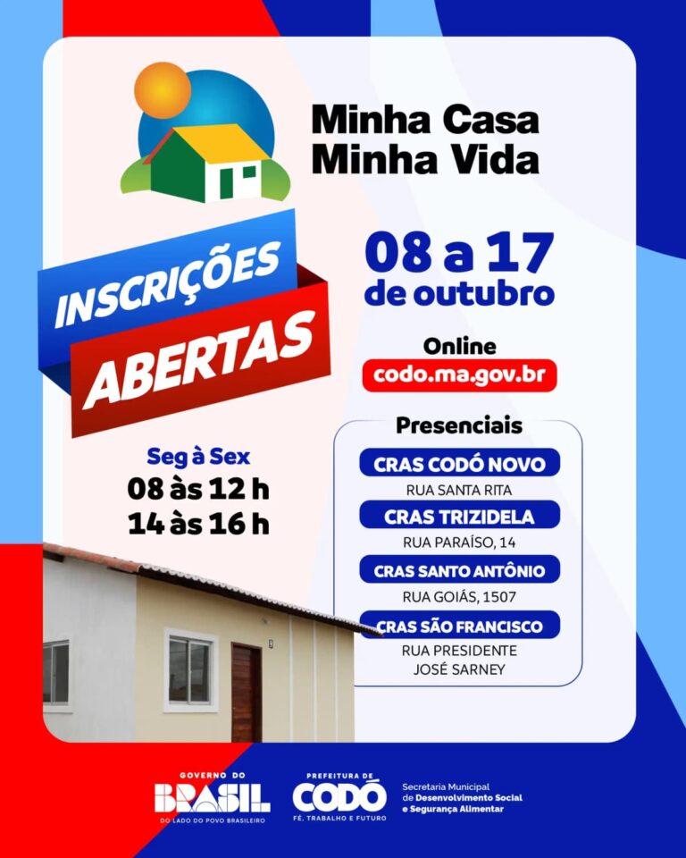 A Prefeitura de Codó, por meio da Secretaria Municipal de Desenvolvimento Social e Segurança Alimentar, informa que estão abertas as inscrições para o Programa Minha Casa Minha Vida, no período de 08 a 17 de outubro de 2025.