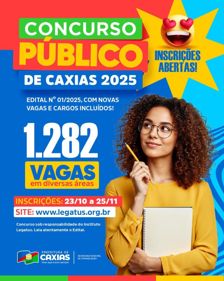 A Prefeitura de Caxias divulgou, nesta quarta-feira (22), no Diário Oficial do Município, o Edital nº 01/2025, que trata da abertura do Concurso Público Municipal. As inscrições estarão abertas no período de 23 de outubro a 25 de novembro de 2025, exclusivamente pelo site www.legatus.org.br.