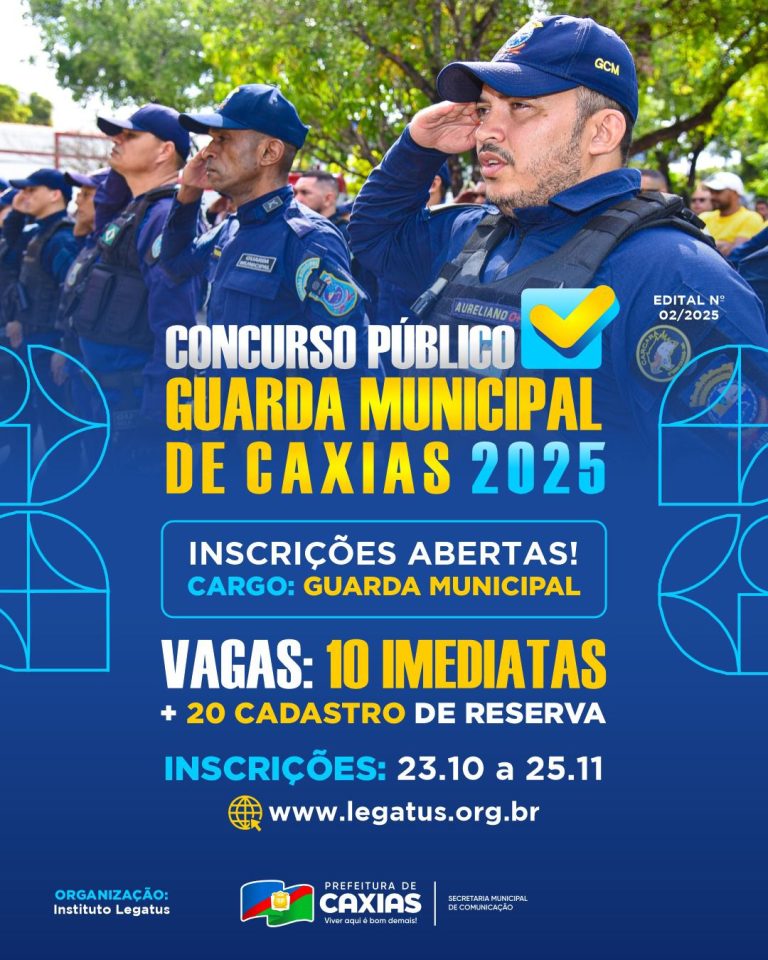 O edital também prevê vagas para a Guarda Municipal de Caxias, conforme o EDITAL Nº 02/2025, sendo 10 vagas para chamamento imediato e 20 para cadastro de reserva. As inscrições para todos os cargos devem ser realizadas exclusivamente pelo site da organizadora www.legatus.org.br.