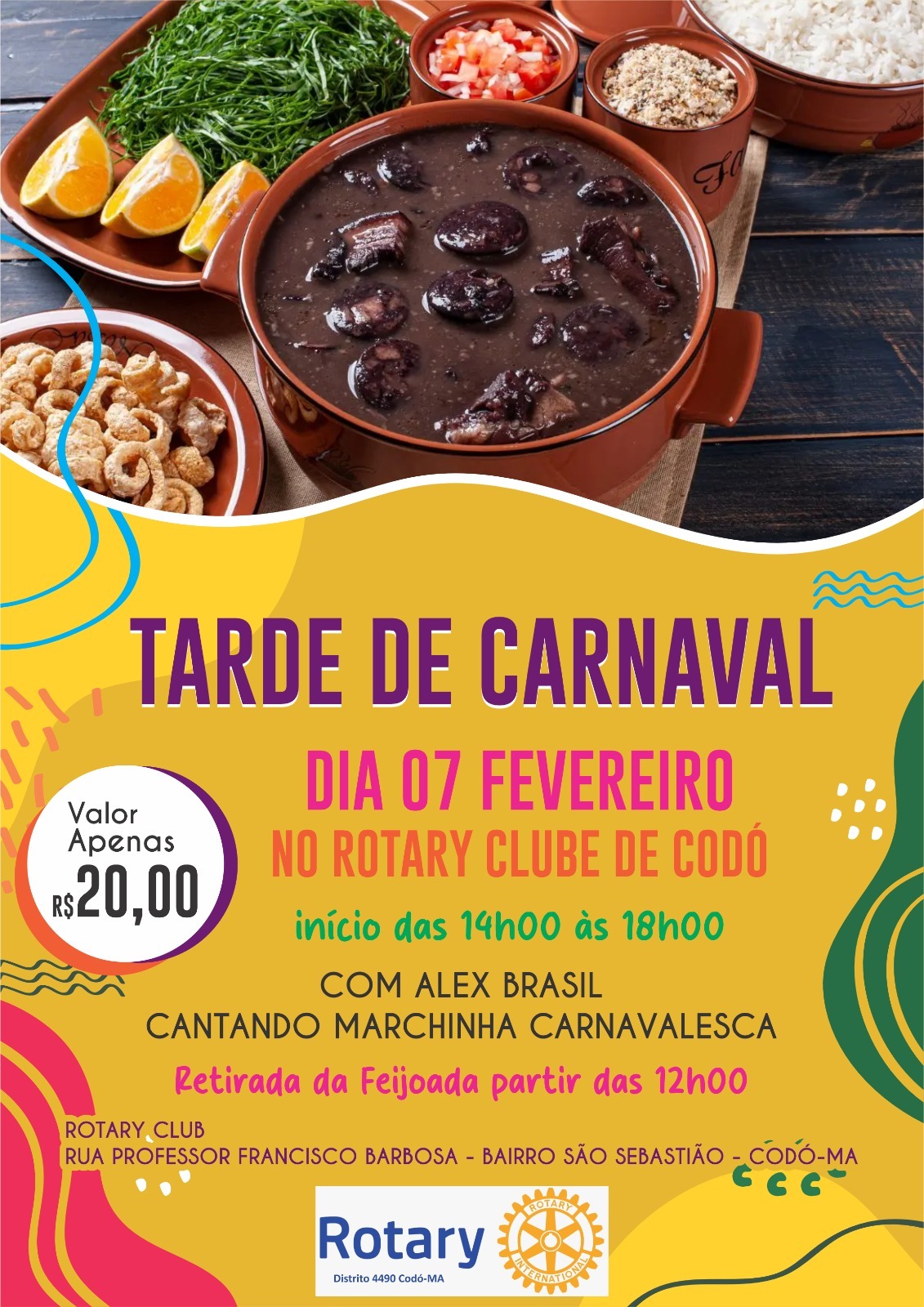 O Rotary Club de Codó promove no próximo dia 07 de fevereiro a sua já tradicional Tarde de Carnaval, um evento que une alegria, confraternização e solidariedade para toda a comunidade.