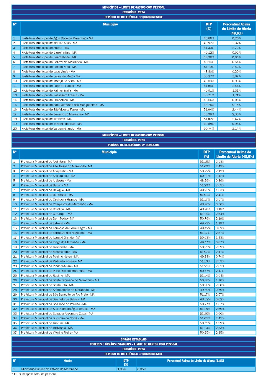 O Tribunal de Contas do Estado (TCE-MA), por meio de sua Secretaria de Fiscalização (Sefis) emitiu, no último dia 20, alerta aos fiscalizados identificados que apresentaram situação desfavorável ou irregular no que diz respeito aos gastos de despesa de pessoal, apurados no 3º quadrimestre e do 2º semestre de 2024.