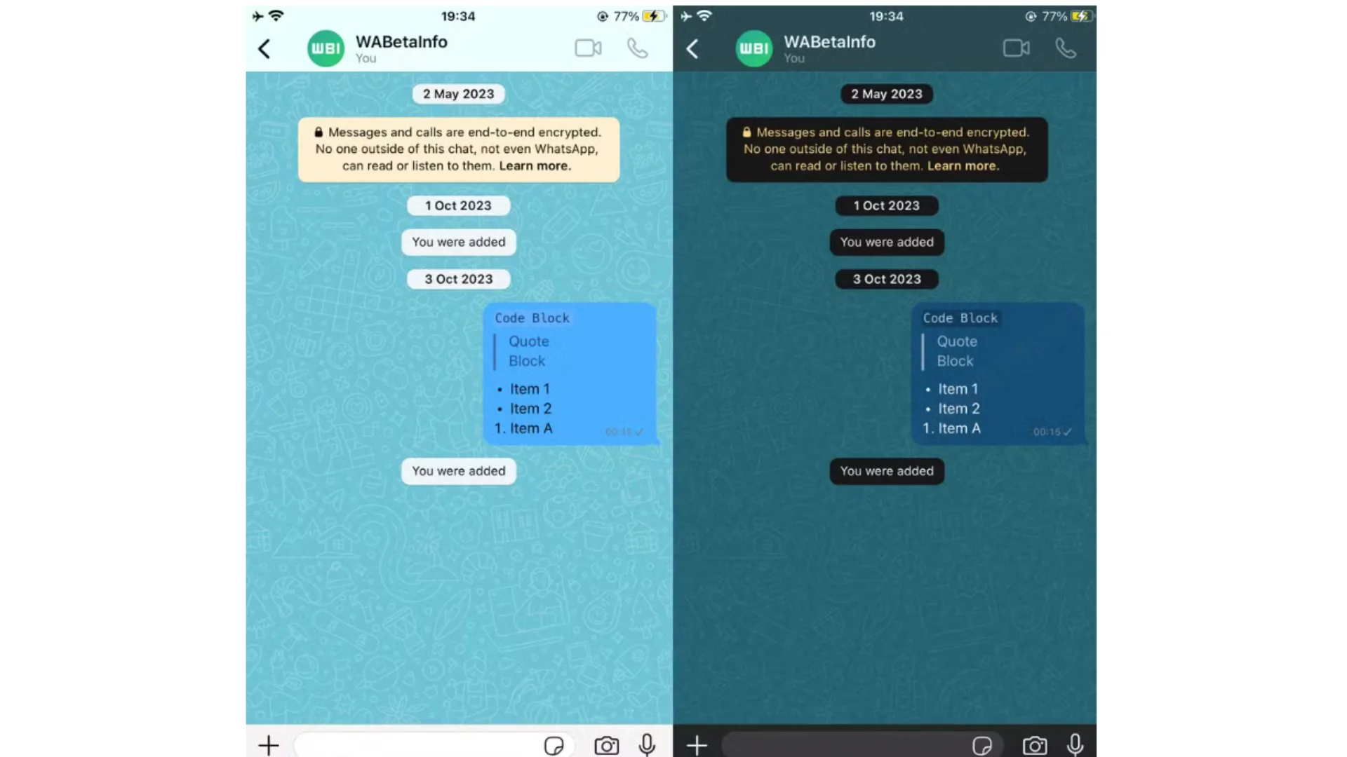 Na versão prévia do recurso, a equipe do WABetaInfo conseguiu deixar o balão de mensagem em dois tons de azul, conforme imagem abaixo. O mensageiro deve disponibilizar apenas cores predefinidas que mantenham a legibilidade das mensagens e os níveis de contraste específicos para uma leitura confortável.